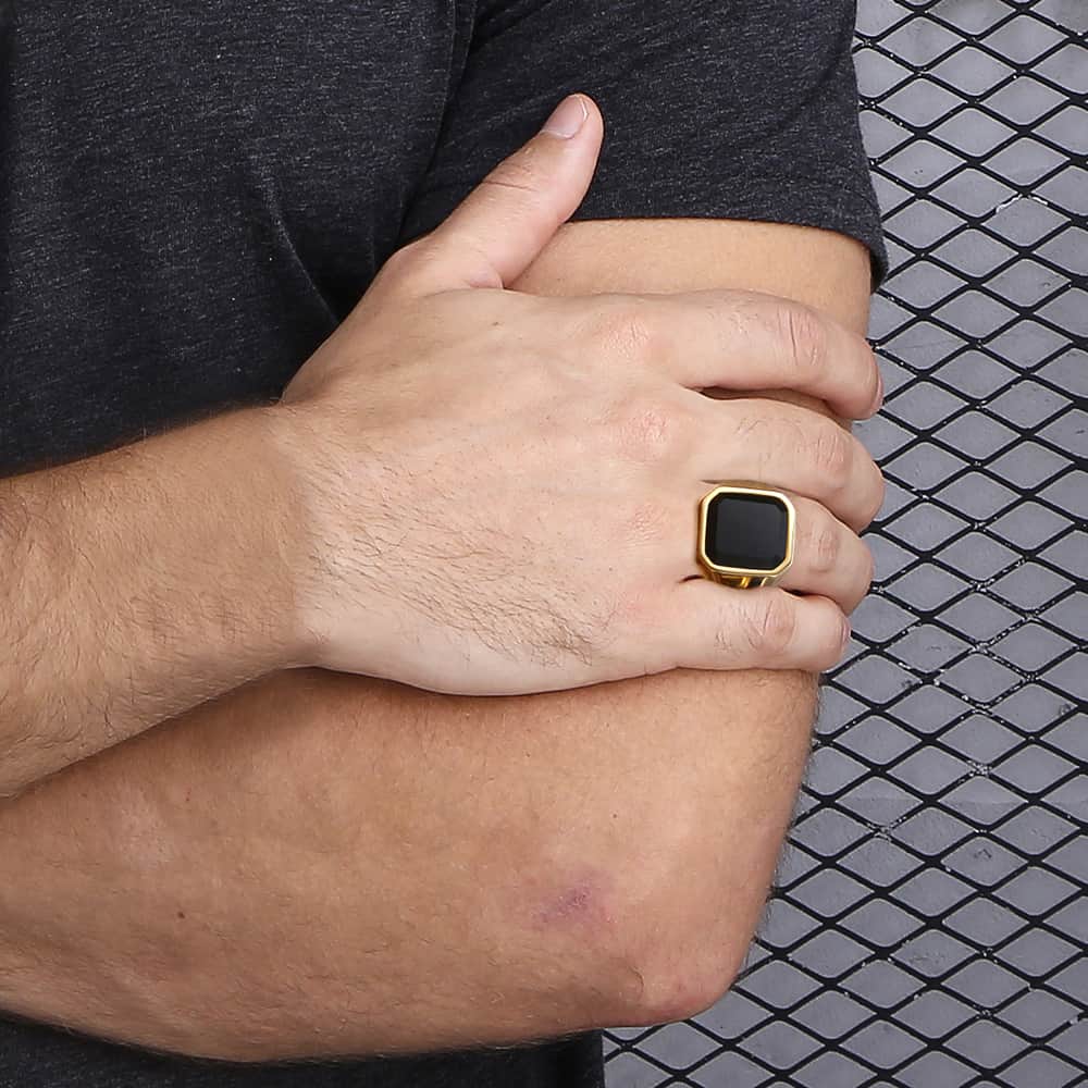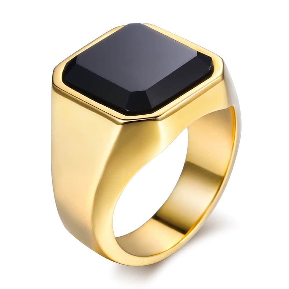Black Carnelian CZ Gold Tone Ring for Men Boys 316L Stainless Steel Signet Rings Square Shape Royal Male Jewelry