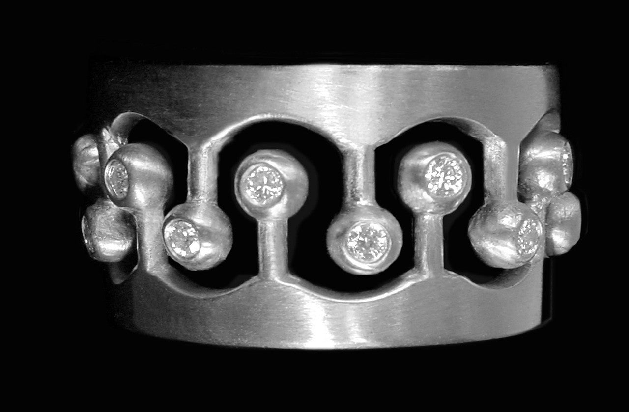 This ring, made of of two rings, fit together with some movement as the dots of diamonds move back and forth to 'hug' each other. It looks great with eternity rings on each side, giving you the opportunity to dress it up and play with color.