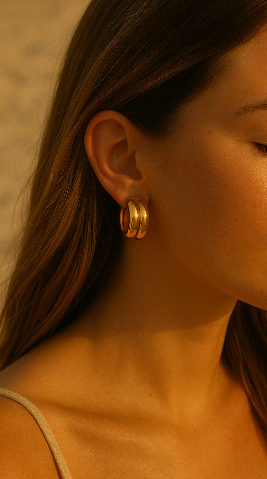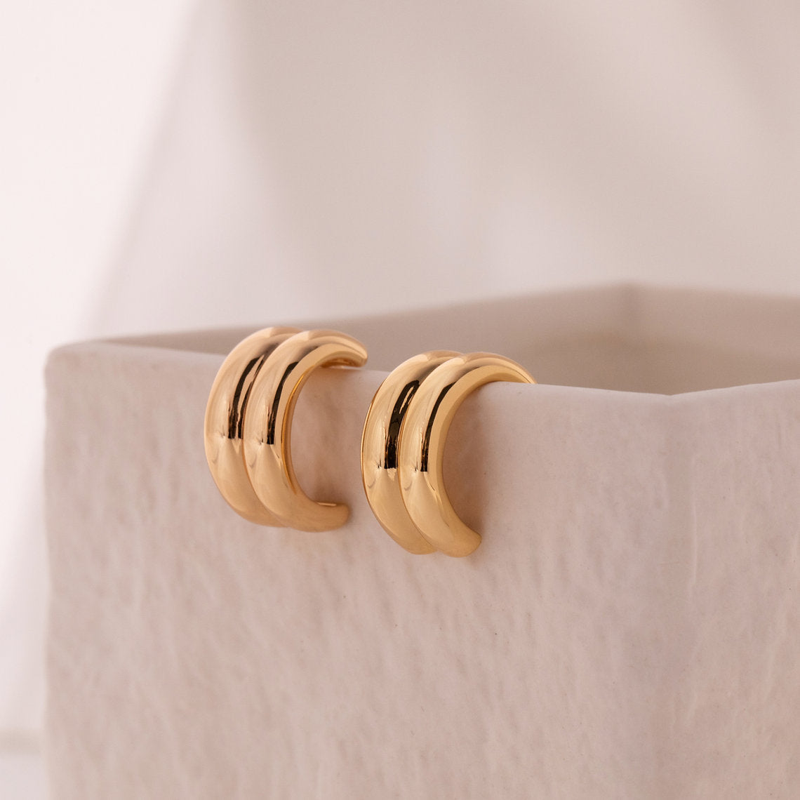 Sculptural and striking, the Double Chunky Hoops are your new staple. Designed with a bold silhouette and a high-polish gold plated finish, they bring effortless impact to any look. The double form adds depth and dimension, while the smooth curves reflect light and style from every angle.