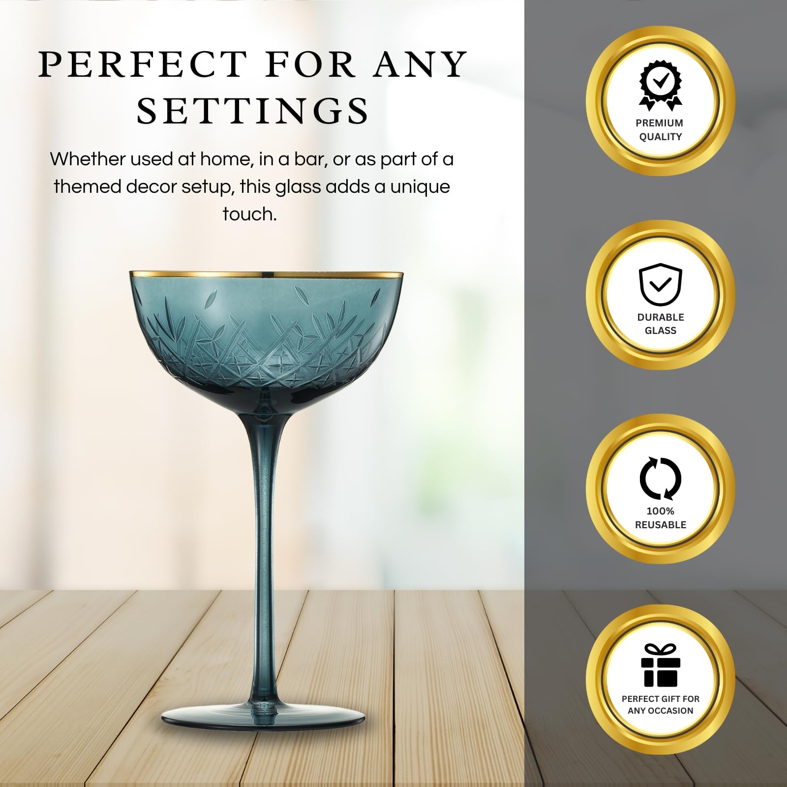 - Offering a unique hand blown Italian style, these coupe champagne glasses are a stunning accent at any table. A collection of six brilliantly colored hand blown Coupe Glasses. These glasses are both stylish and practical for serving Martini's, champagne or cocktails. The attractive gold rim around each glass is not only an attractive design element, but also adds a bit of sophistication to any table setting.